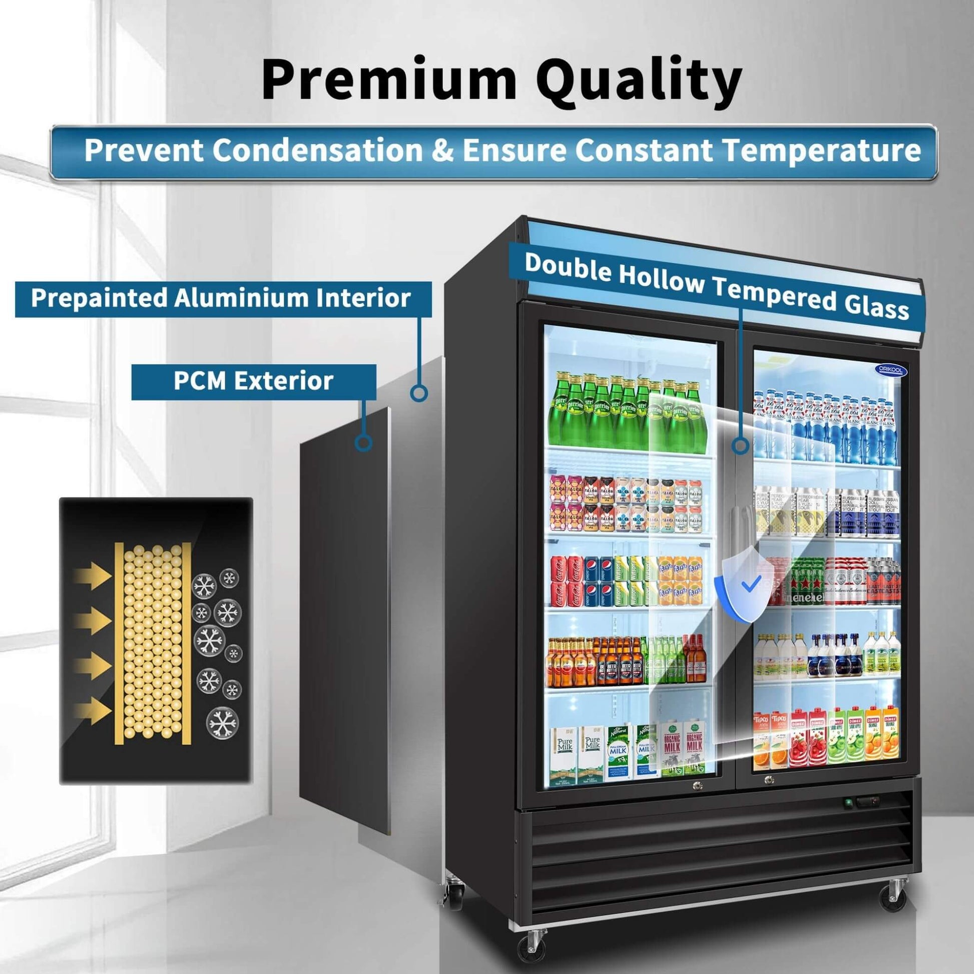 Showcase your best products with this 44.7 Cu.Ft Double-Door Commercial Display Merchandising Refrigerator! The double hollow tempered glass doors offer crystal-clear visibility while maintaining superior thermal efficiency, so your customers can see exactly what delicious options you have in store. Plus, the energy-efficient LED lighting illuminates every corner, making your merchandise pop and encouraging impulse buys. You can even personalize the top panel with your own logo to boost brand recognition instantly!