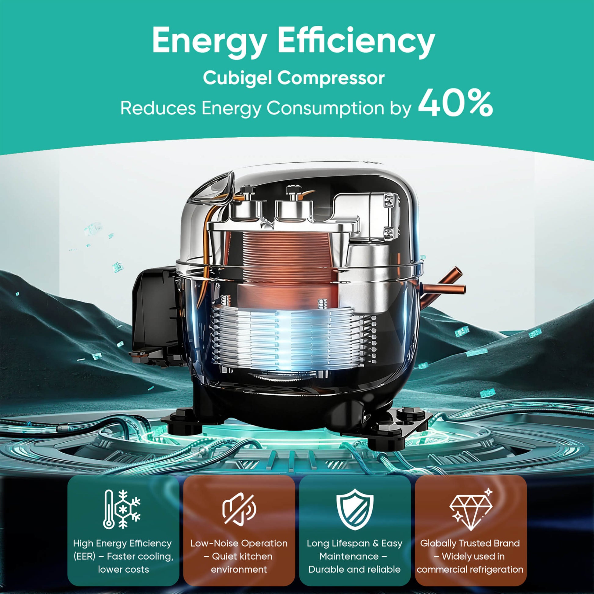 - The bottom-mounted blower condenser and environmentally friendly R290 refrigerant ensure efficient cooling performance while meeting modern energy standards.
