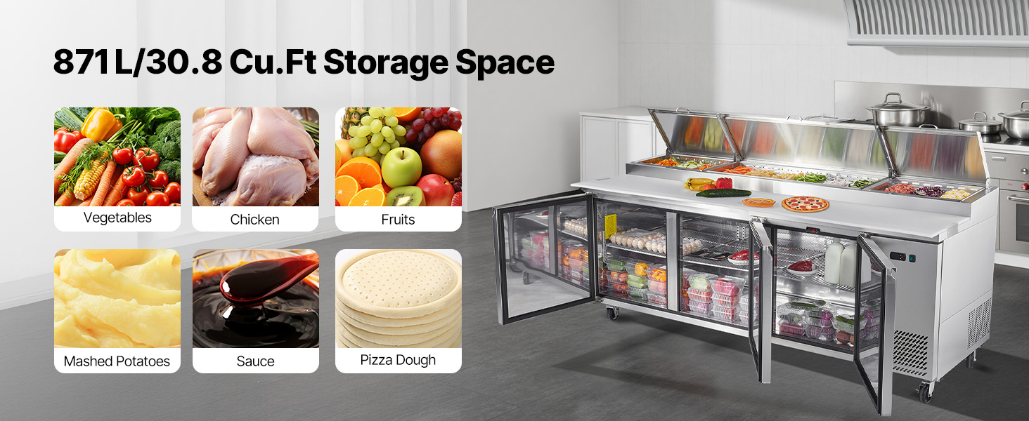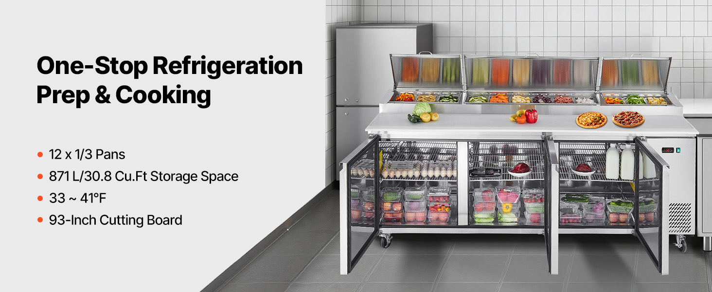 - 30.8 Cu.Ft. Capacity: Skilled in cold storage and freshness, this refrigerated prep table includes a 93 x 20 inch cutting board for pizza-making. The perforated shelf has 12 stainless steel 1/3 pans that are heavy-metal free and easy to clean