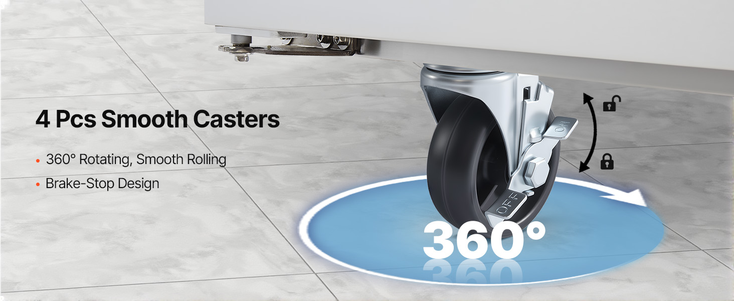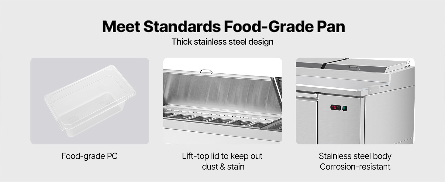 - Premium Material: Featuring food-grade PC pans that meet NSF & ANSI tested standards, this food prep fridge is built with a stainless steel body for durability and includes brake casters for effortless mobility