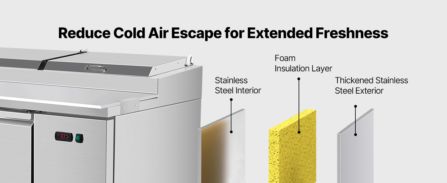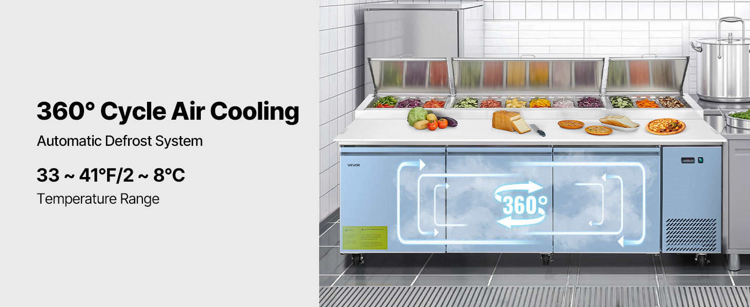 - Quick & Efficient Cooling: With a Cubigle compressor and finned copper tubes, this pizza prep table refrigerator ensures consistent, even cooling to keep food fresh longer. Complies with UL, CSA & NSF tested standards