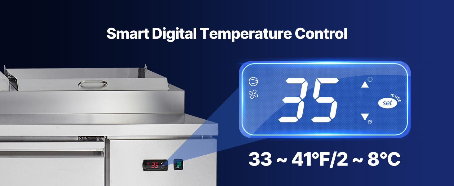 - Electronic Temperature Control: With a digital control screen, this prep refrigerator table maintains temperatures at 33~41℉, so vegetables, sauces, fruits, and meats stay fresh