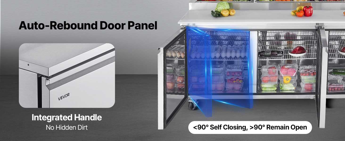 - Auto-Closing Door: When the door opens within 90°, it automatically snaps shut—no need to push, and no cold air lost. The adjustable shelving in this prep table refrigerator provides two-tier storage, with each shelf holding up to 88 lbs